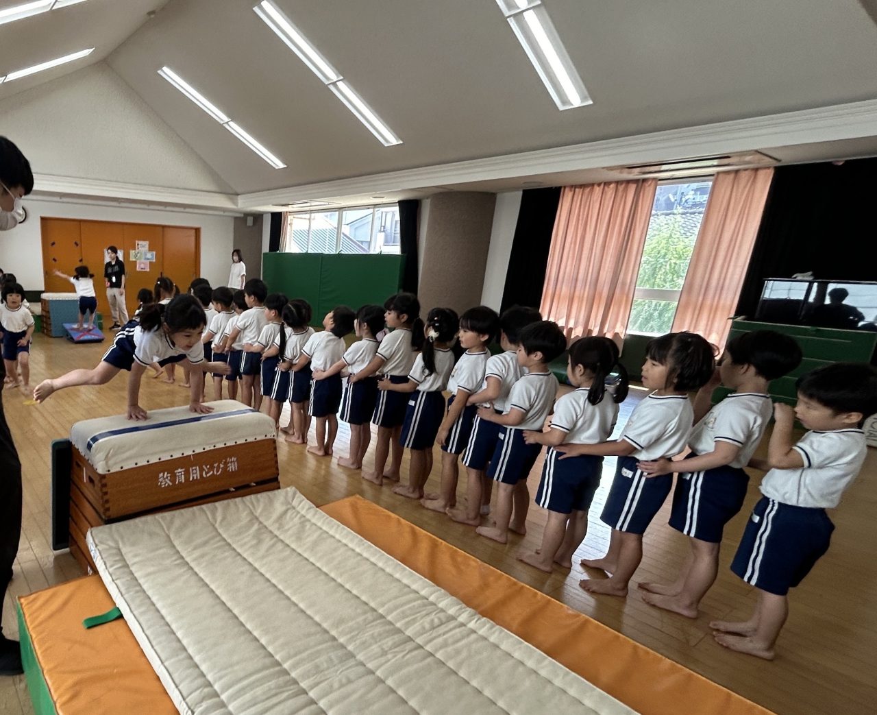 今日は年長組さん全員で、跳び箱の「はやとび」練習を行いました!(^^)!