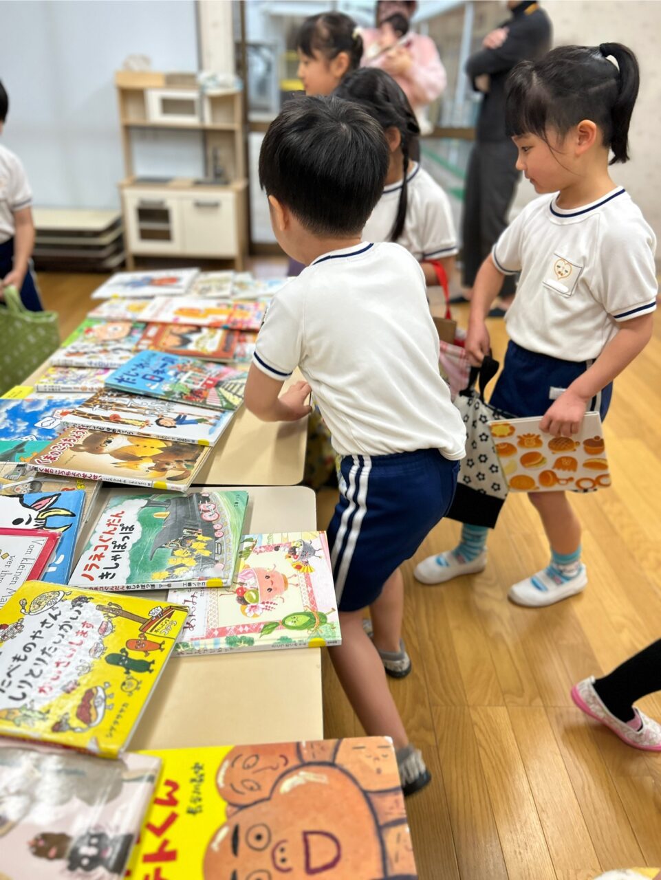 絵本の貸出の日は、毎度『絵本の会』の保護者の方が来てくださって子どもたちの絵本貸出を受付けしてくださっています☆彡