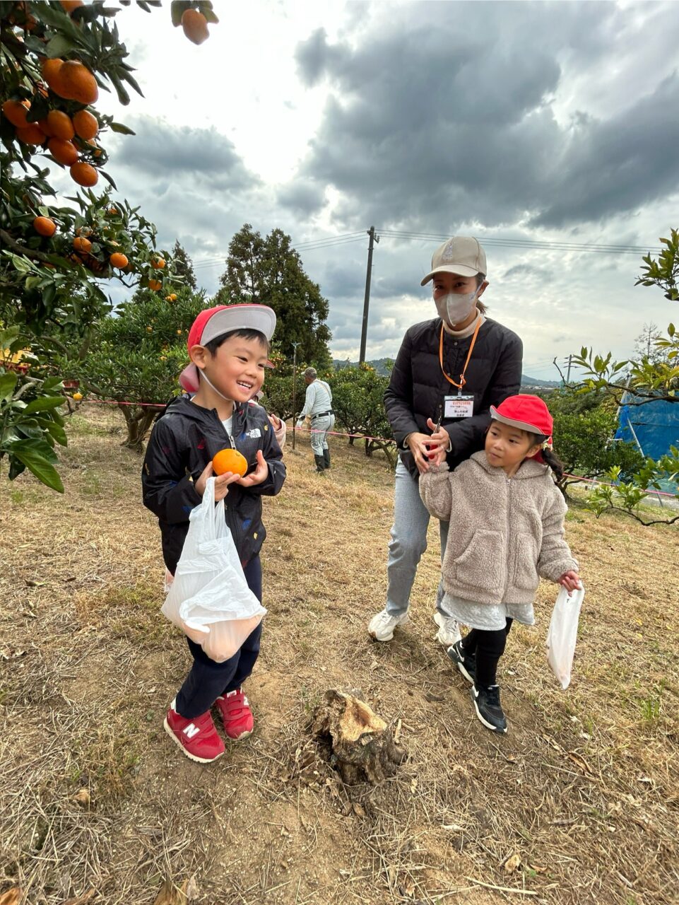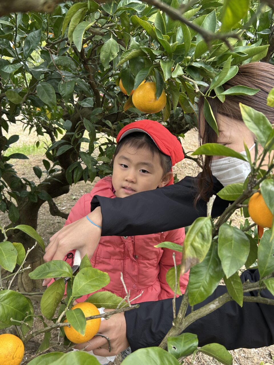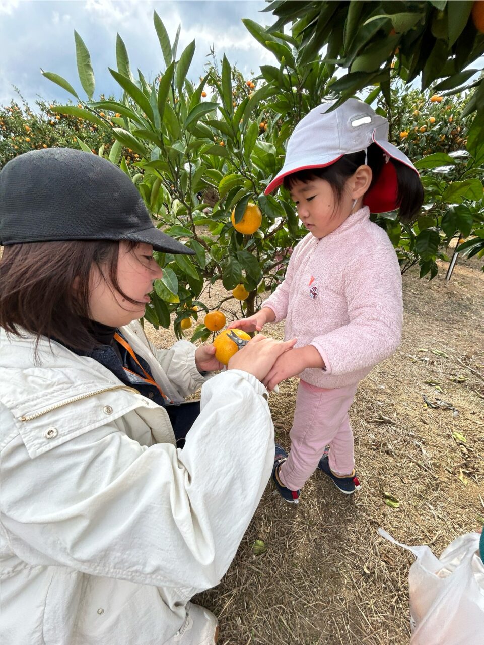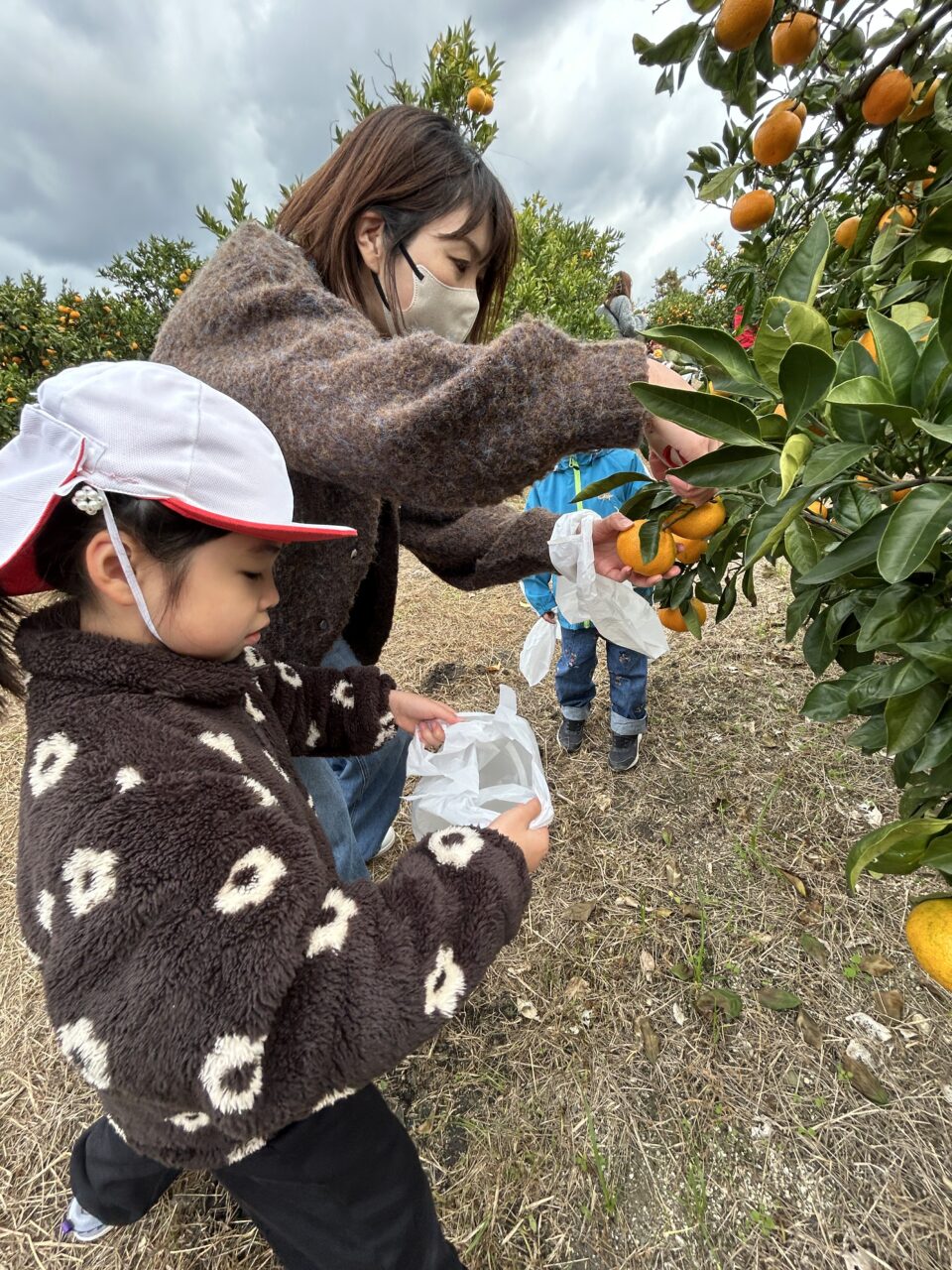 お手伝いに来てくださったお母さんやお父さんにサポートをしてもらいながら、ミカン狩りしていきます(*^▽^*)