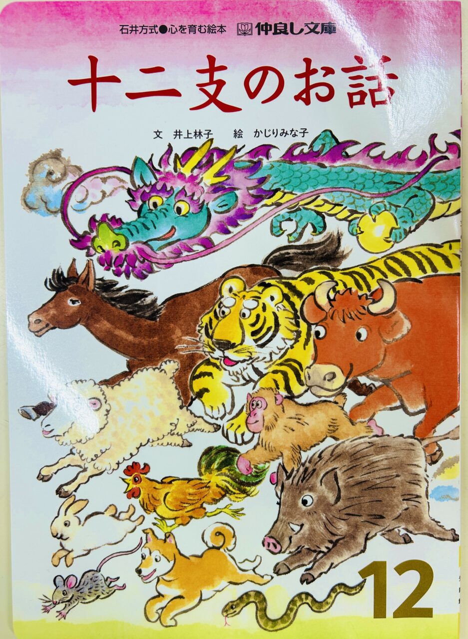 お正月に神様のところへあいさつに行くことになった動物たち。ちゃっかりもののねずみは牛の背にのり、門の前で一足先にゴールイン。一番最初はねずみ年になった…(*^-^*)