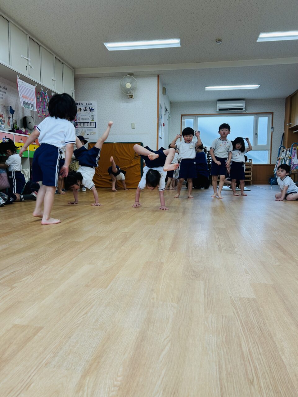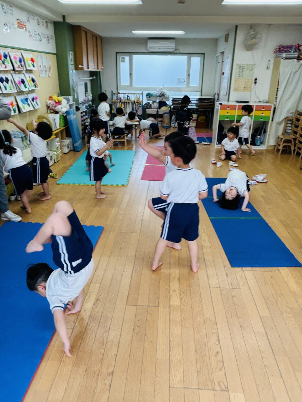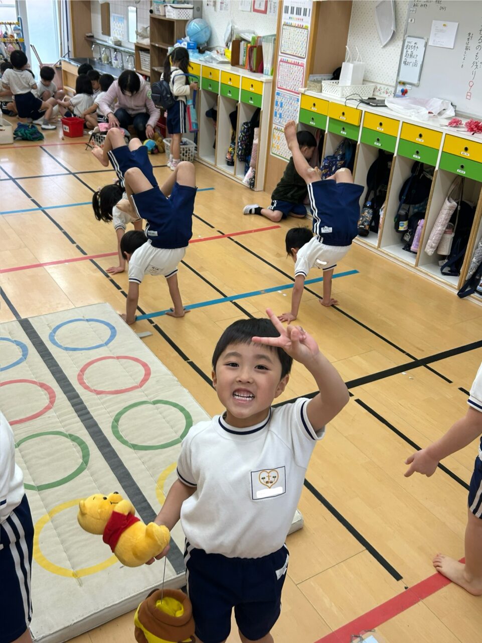教室で2クラスともに、体操で逆立ち歩きをいつも通りに練習して遊んでみたり、