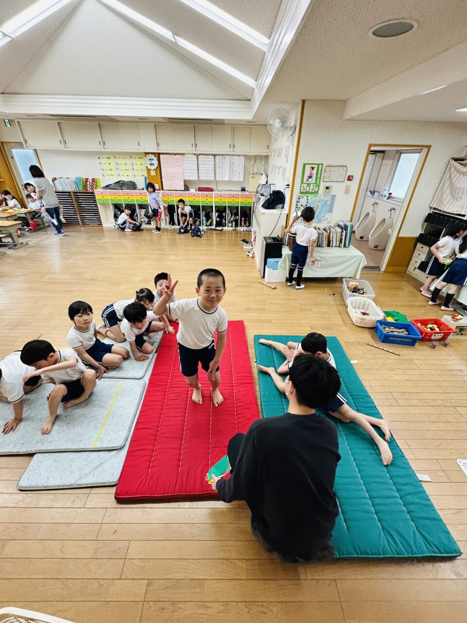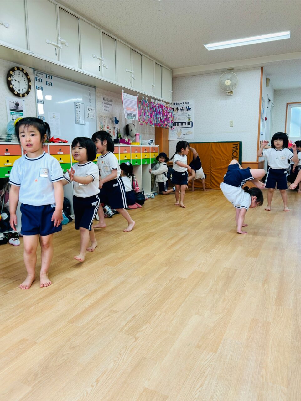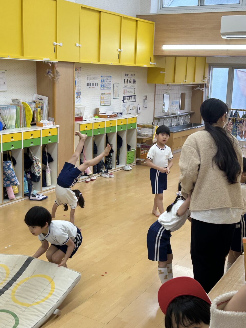 教室で2クラスともに、体操で逆立ち歩きをいつも通りに練習して遊んでみたり、